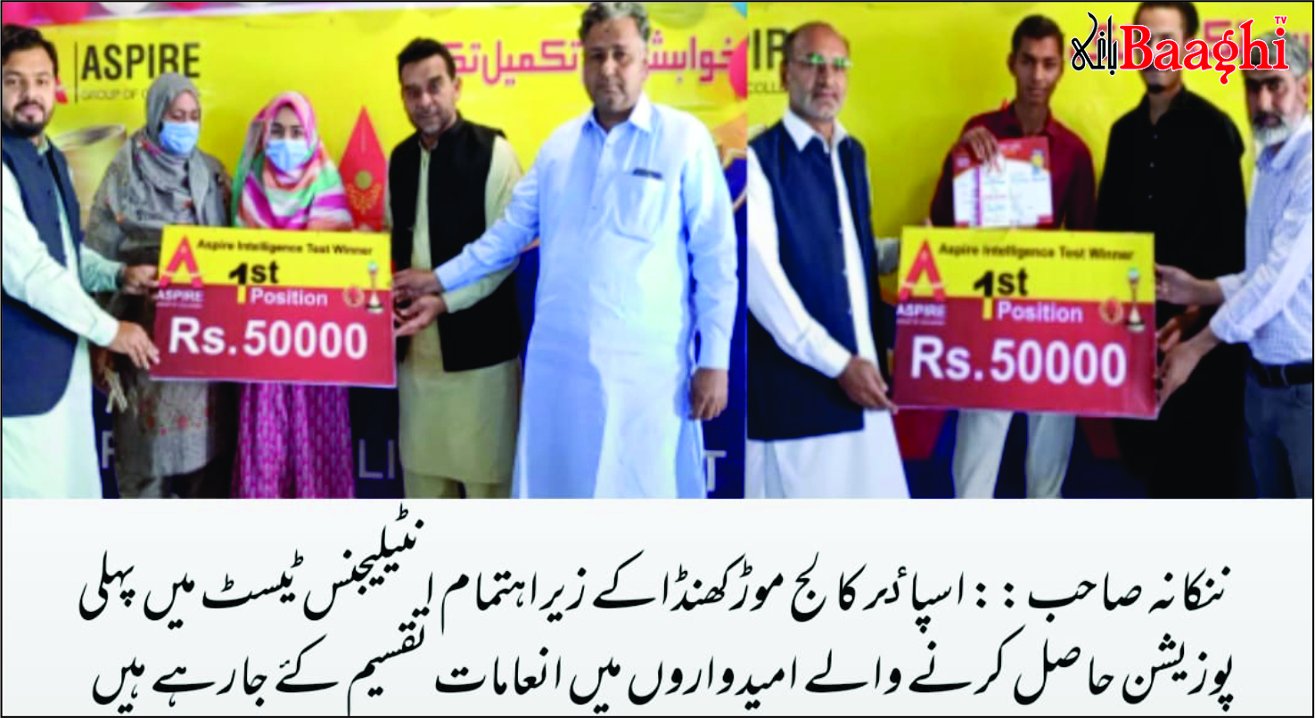 ننکانہ صاحب(نامہ نگاراحسان اللہ ایاز) اسپائر کالج موڑکھنڈا نے اپنے زیر اہتمام منعقدہ اسپائر انٹیلیجنس ٹیسٹ میں نمایاں پوزیشن حاصل کرنے والے طلباء و طالبات کے اعزاز میں ایک تقریب