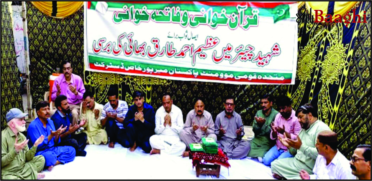 میرپورخاص(باغی ٹی وی، نامہ نگار سید شاہزیب شاہ) شہید عظیم احمد طارق کی 32ویں برسی پر قرآن خوانی و فاتحہ خوانی میرپورخاص میں ایم کیو ایم پاکستان ڈسٹرکٹ کے زیراہتمام