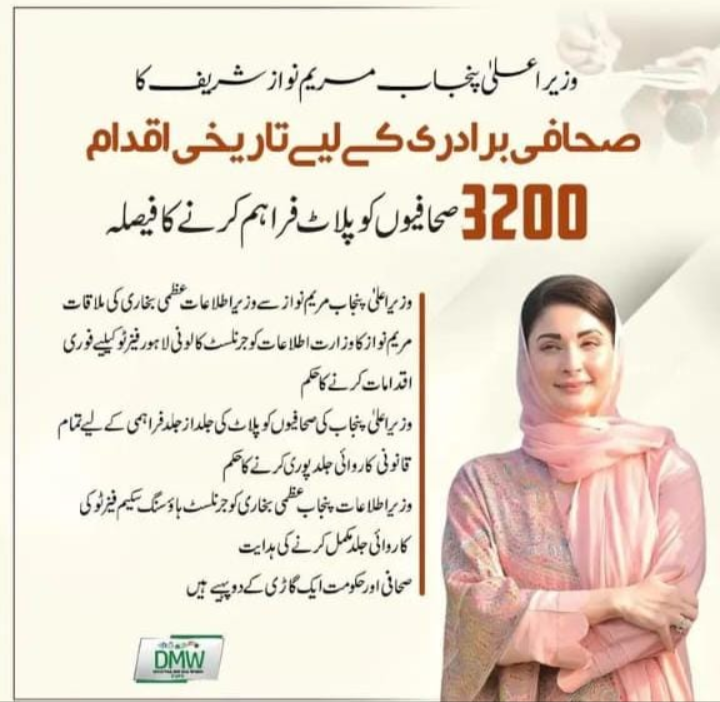 وزیراعلی پنجاب کی صحافیوں کو پلاٹ کی جلد از جلد فراہمی کے لئے تمام قانونی تقاضے جلد پورے کرنے کا حکم صادر کر دیا گیا ہے