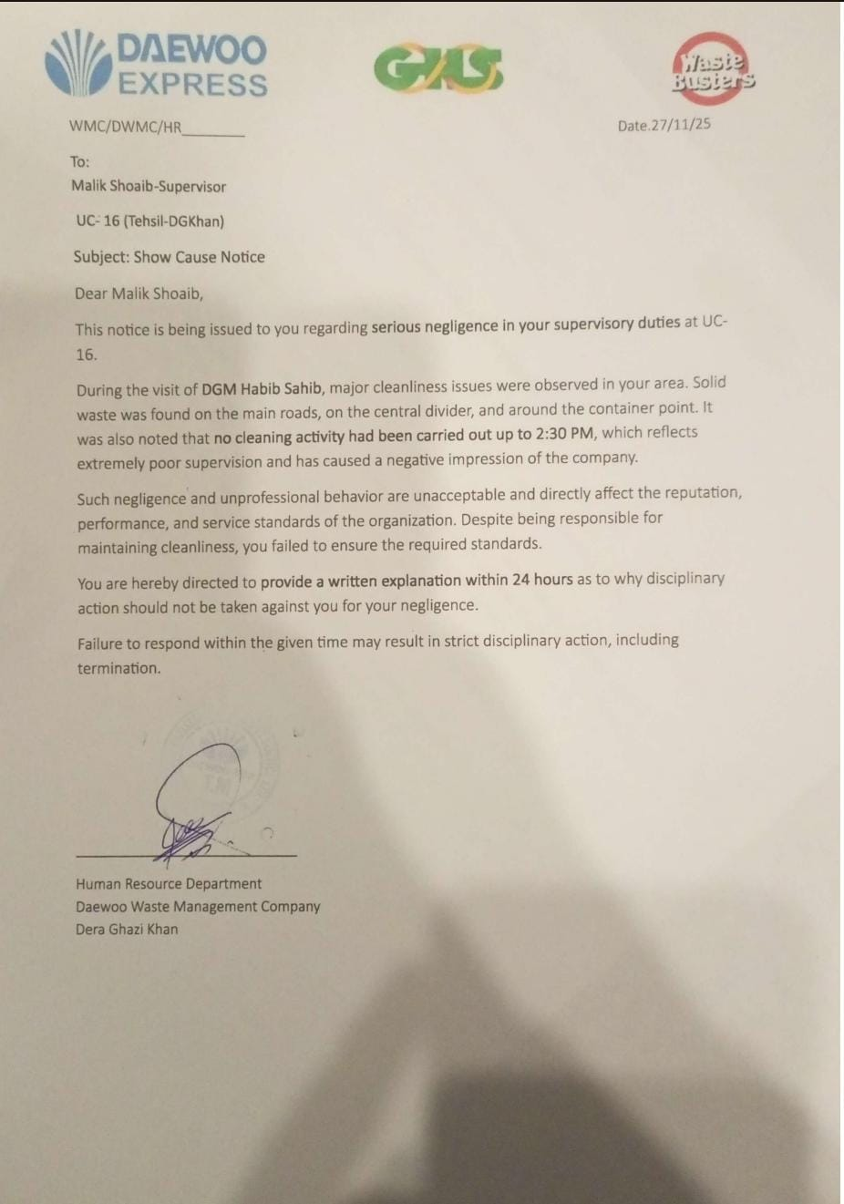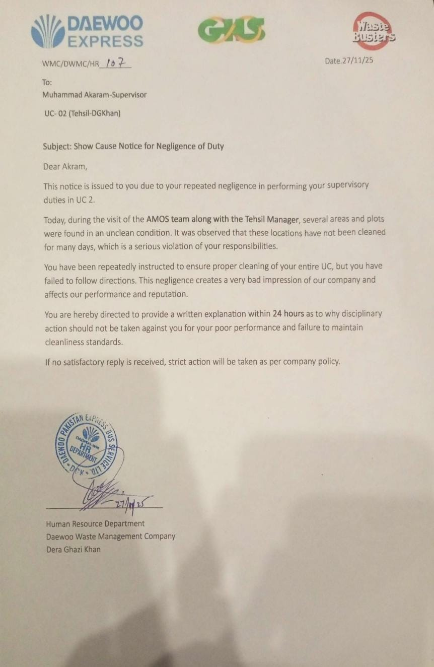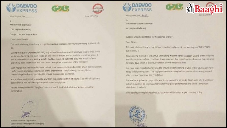 ڈیرہ غازی خان (باغی ٹی وی،سٹی رپورٹر) وزیر اعلیٰ پنجاب مریم نواز کے ویژن "ستھرا پنجاب” اور ڈپٹی کمشنر ڈیرہ غازی خان کی واضح ہدایات کے مطابق ڈائیوو ویسٹ مینجمنٹ نے صفائی کے نظام میں غفلت برداشت نہ کرتے ہوئے سخت انضباطی کارروائی کی ہے۔ اس کارروائی میں ایک سپروائزر کو نوکری سے برخاست اور دو ملازمین کو شوکاز نوٹس جاری کیے گئے۔