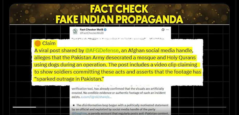 وزارتِ اطلاعات و نشریات پاکستان نے افغان میڈیا کی پاکستان مخالف جعلی اور گمراہ کن خبروں کا پول کھول دیا،فریب پر مبنی افغان سوشل میڈیا اکاؤنٹس نے پاک فوج پر مساجد کی ہے حرمتی کا بے بنیاد الزام لگایا ،افغان سوشل میڈیا ہینڈل نے جھوٹا دعویٰ کیا کہ پاک فوج نے مسجد اور قرآنِ مجید کی بے حرمتی کی،افغان اکاؤنٹ کی جانب سے ویڈیو میں فوجی اہلکاروں پر مسجد میں کتوں کے استعمال کا بے بنیاد الزام لگایا گیا