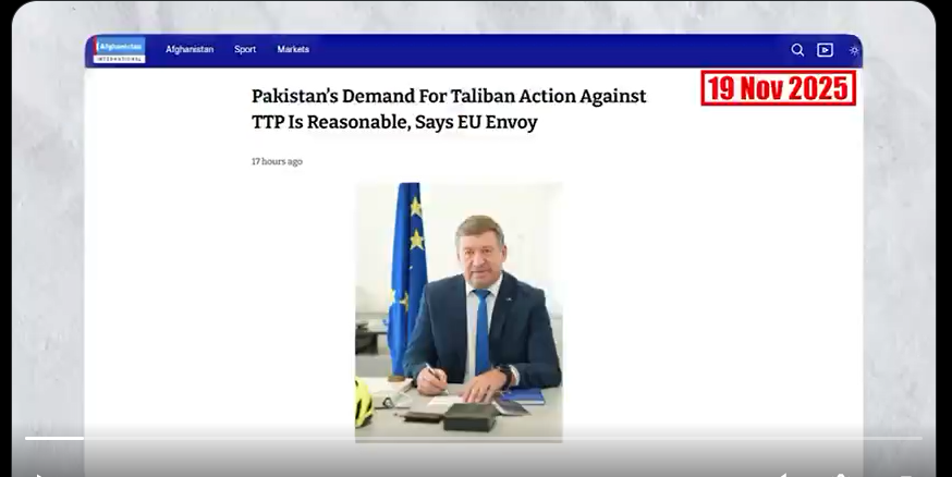 یورپی یونین میں افغانستان میں موجود دہشتگردوں کی محفوظ پناہ گاہوں پر پاکستان کے مؤقف کی تائید کی گئی،یورپی یونین کے سفیر نے پاکستان کا طالبان سے کالعدم ٹی ٹی پی(فتنہ الخوارج) کے خلاف کارروائی کا مطالبہ معقول قرار دے دیا ، یورپی یونین کے سفیر رائمونڈاس کاروبلس کا کہنا تھا کہ؛ پاکستان کا افغانستان سےٹی ٹی پی(فتنہ الخوارج) کے خلاف اقدام کا مطالبہ جائز اور حقیقی سیکیورٹی تشویش کی بنیاد پر ہے،یورپی یونین دہشت گردی کی مذمت کرتی ہے، پاکستان کے خدشات سرحد پار سے پیدا ہونے والے سیکیورٹی خطرات پر مبنی ہیں، افغانستان میں موجود عسکریت پسند پاکستان میں حالیہ حملوں میں ملوث ہیں،