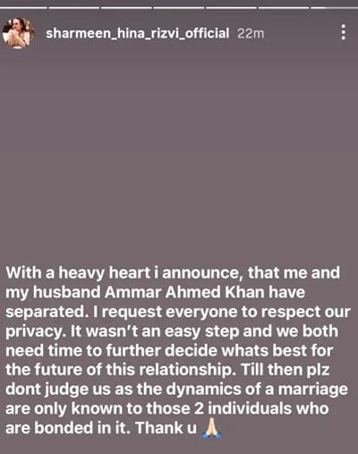 انہوں نے لکھاکہ’بہت دکھی دل کے ساتھ میں اعلان کرتی ہوں کہ میرے اور عمار احمد خان کے درمیان علیحدگی ہوچکی ہے میں سب سے گزارش کرتی ہوں کہ ہماری پرائیویسی کا احترام کریں یہ فیصلہ آسان نہیں تھا اور ہم دونوں کو اس رشتے کے مستقبل کے بارے میں مزید سوچنے کےلیے وقت درکار ہے تب تک، براہِ کرم ہمیں جج نہ کریں کیونکہ شادی کے تعلق کی اصل نوعیت صرف ان دو افراد کو معلوم ہوتی ہے جو اس بندھن میں جڑے ہوتے ہیں،شکریہ۔