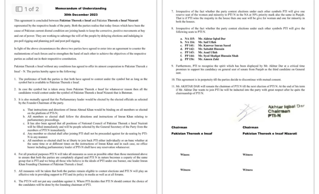 قبل ازیں پی ٹی آئی اور تحریک انصاف نظریاتی کے درمیان ٹکٹوں کی تقسیم کا معاہدہ سامنے آ گیا، معاہدہ 30 دسمبر 2023 کو ہوا،پی ٹی آئی نظریاتی نے ٹکٹوں کے بدلے پی ٹی آئی سے 2 قومی صوبائی اسمبلیوں سے 5 ٹکٹ لیے،تحریک انصاف نظریاتی نے ٹکٹوں کے بدلے پی ٹی آئی سے 2 مخصوص نشستیں بھی لیں ، معاہدے میں کہا گیا کہ تحریک انصاف نے چیئرمین پی ٹی آئی نظریاتی کو سینیٹ میں بھی سپورٹ کرنا ہے ،