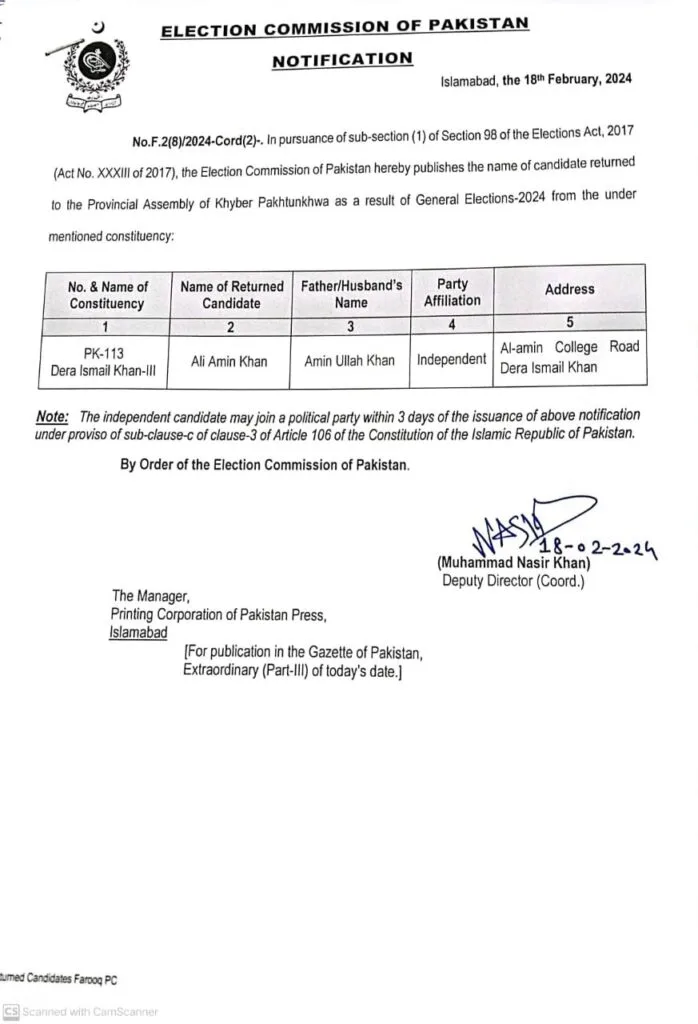 اسلام آباد: الیکشن کمیشن نے نامزد وزیر اعلیٰ خیبر پختونخوا علی امین گنڈاپور کی کامیابی کا نوٹیفکیشن جاری کر دیا گیا۔