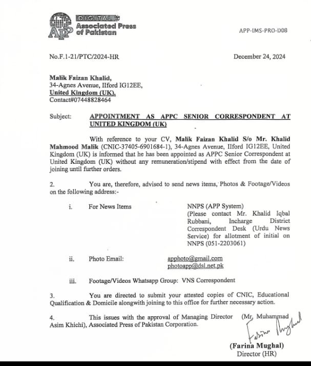 پاکستان کے قومی خبررساں ادارے اے پی پی (ایسوسی ایٹڈ پریس آف پاکستان) نے ایک باورچی کو برطانیہ میں اپنے نئے نمائندے،سینئر رپورٹر کے طور پر مقرر کر لیا ہے۔ اے پی پی نے فیضان خالد کو برطانیہ (یو کے) میں سینئر رپورٹر کے طور پر تعینات کرنے کا اعلان کیا ہے۔اے پی پی کی طرف سے جاری کردہ نوٹیفکیشن کے مطابق، ملک فیضان خالد، جو کہ 34-ایگنیس ایونیو، ایل فورڈ آئی جی12EE، یو کے میں مقیم ہیں، کو اے پی پی کا سینئر رپورٹر مقرر کیا گیا ہے۔ فیضان خالد کو خبریں، تصاویر اور ویڈیوز مخصوص ای میل ایڈریسز اور واٹس ایپ گروپ میں ارسال کرنی ہوں گی۔ اس کے لیے انچارج ڈسٹرکٹ رپورٹر ڈیسک سے رابطہ کیا جا سکتا ہے، نوٹفکیشن میں ای میل ایڈریسز بھی دیئے گئے ہیں.ملک فیضان خالد کو ہدایت دی گئی ہے کہ وہ اپنے شناختی کارڈ، تعلیمی اسناد اور ڈومیسائل کی مصدقہ کاپیاں اس دفتر میں جمع کرائیں تاکہ ضروری کارروائی کی جا سکے۔یہ نوٹیفکیشن ایسوسی ایٹڈ پریس آف پاکستان کے منیجنگ ڈائریکٹر جناب محمد آصف کھچی کی منظوری کے بعد جاری کیا گیا ہے۔