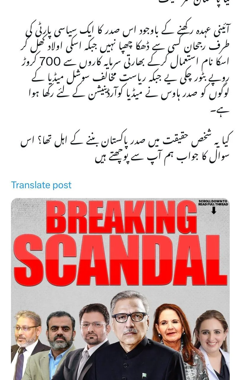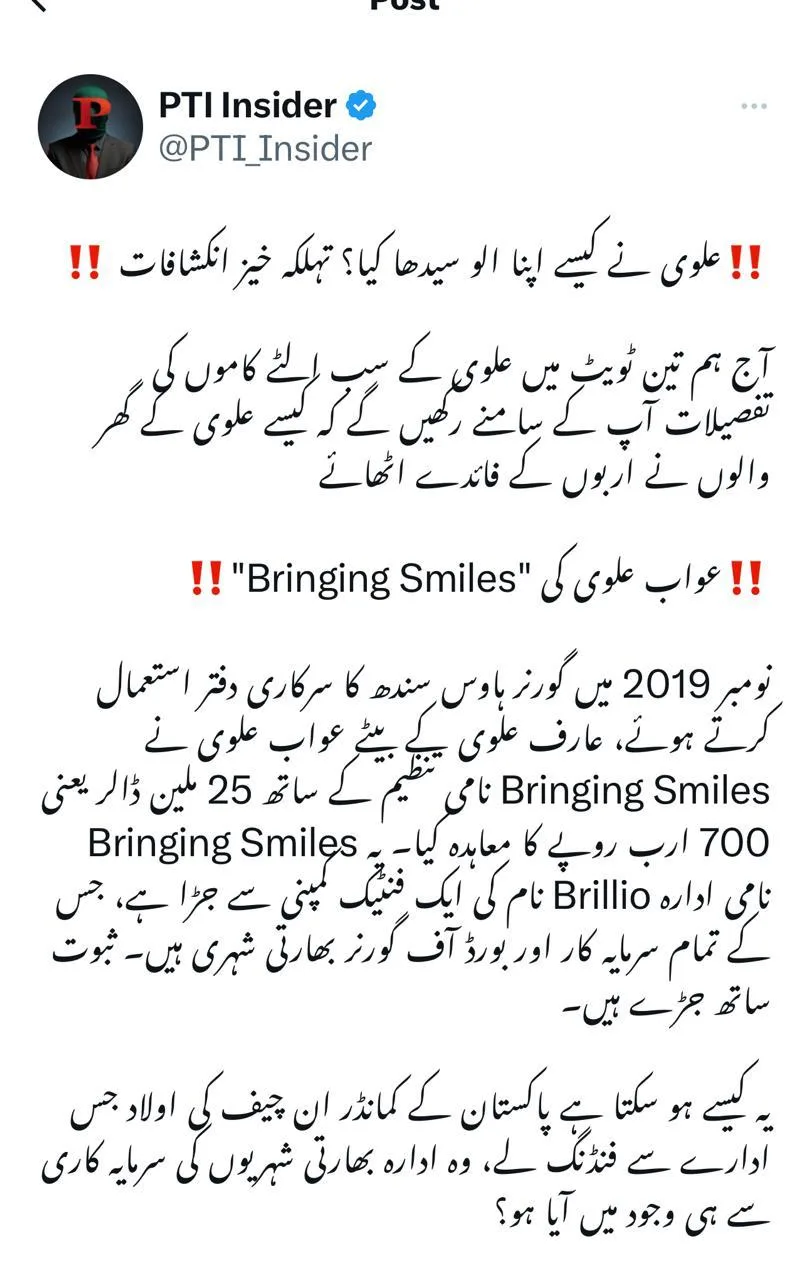 ٹویٹ میں بتایا گیا کہ نومبر میں گورنر ہاؤس سندھ کا سرکاری دفتر استعمال کرتے ہوئے عارف علوی کے بیٹے عواب علوی نےBringing Smiles   برنگنگ سمائلز نامی تنظیم کے ساتھ پچیس ملین ڈالر یعنی سات سو ارب روپے کا معاہدہ کیا مذکورہ ادارہ   Brilio نام کی ایک فنٹیک کمپنی سے جڑا ہے جس کے تمام سرمایہ کار اور بورڈ آف گورنر بھارتی شہری ہیں  یہ کیسے ہو سکتا ہے کہ پاکستان کے کمانڈر ان چیف کی اولاد جس ادارے سے فنڈنگ کے وہ ادارہ بھارتی شہریوں ہی کہ سرمایہ کاری سے وجود میں آیاہو؟