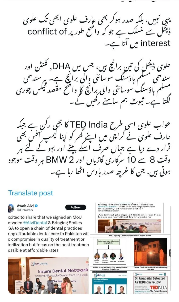 یہی نہیں بلکہ صدر ہو کر بھی عارف علوی ابھی تک ڈینٹل سے منسلک ہے جو کہ واضح طور پر میں "conflict of interest” آتا ہے