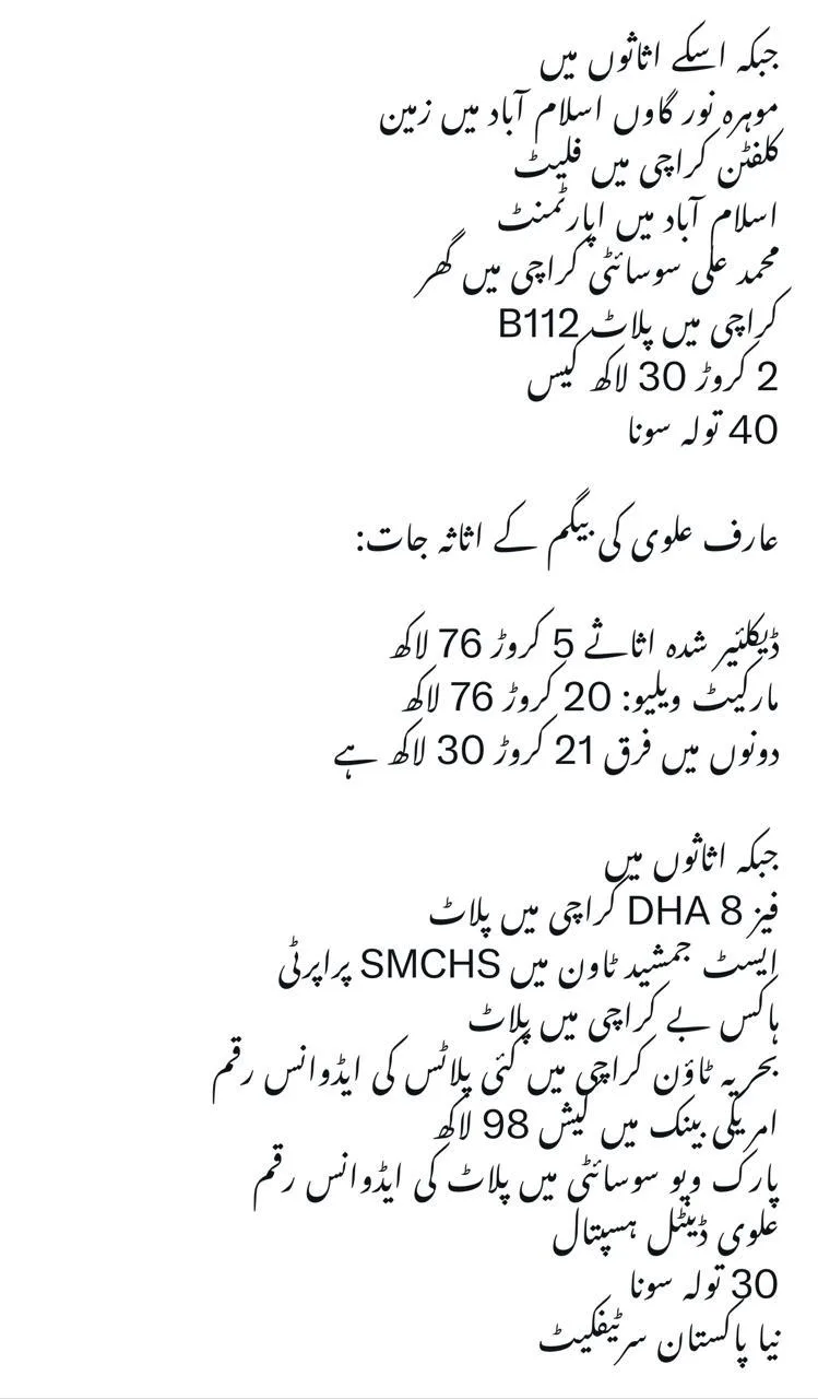 جبکہ اثاثوں میں ڈی ایچ اے فیز 8 کراچی میں پلاٹ ایسٹ جمشید ٹاؤن میں ایس ایم سی ایچ ایس پراپرٹی،ہاکس بے کراچی میں پلاٹ،بحریہ ٹاؤن کراچی میں کئی پلاٹس کی ایڈوانس رقم،امریکی بینک میں کیش 98 لاکھ پارک ویو سوسائٹی میں پلاٹ کی ایڈوانس رقم ،علوی ڈینٹل ہسپتال ،30 تولہ سونا نیا پاکستان سرٹیفیکیٹ