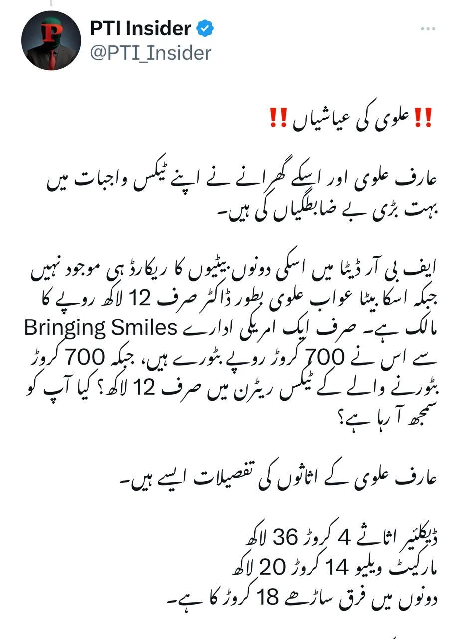 ایف بی آر ڈیٹا میں اس کی دونوں بیٹیوں کا ریکارڈ ہی موجود نہیں جبکہ اس کا بیٹا عواب علوی بطور ڈاکٹر صرف بارہ لاکھ روپے کا مالک ہے۔صرف ایک امریکی ادارے برنگنگ سمائلز سے اس نے 700 کروڑ روپے بٹور رہے ہیں جبکہ 700 کروڑ بٹورنے والے کے ٹیکس ریٹرن میں صرف 12 لاکھ؟ کیس آپ کو سمجھ آرہا ہے؟