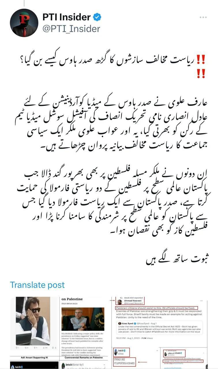 عارف علوی نے صدر ہاؤس کے میڈیا کوآرڈینیش کے لیے عادل انصاری نامی تحرک انصاف کی آفیشل سوشل میڈیا ٹیم کے رکن کو بھارتی کیا یہ(عارف علوی) اور عواب علوی مل کر ایک سیاسی جماعت کا ریاست مخالف بیانیہ پروان چڑھاتے ہیں۔