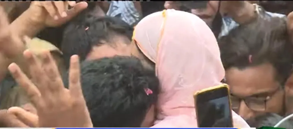 قومی ہیرو اور اولمپک ایتھلیٹ ارشد ندیم آج میاں چنوں میں اپنے آبائی گھر پہنچ گئے، جہاں ان کا شاندار استقبال کیا گیا۔ گھر پہنچتے ہی انہوں نے اپنی والدہ کو گلے لگایا اور اٹھا لیا، جس پر والدہ جذبات سے مغلوب ہو کر ان کا ہاتھ چومتی رہیں اور آنکھیں پرنم ہو گئیں۔ اس جذباتی منظر نے ہر کسی کے دل کو چھو لیا۔ارشد ندیم بھی اپنی والدہ کو گود میں اٹھا کر جذبات پر قابو نہ رکھ سکے اور آبدیدہ ہو گئے۔ ان کے استقبال کے لیے شہریوں کی بڑی تعداد امڈ آئی، جنہوں نے اپنے ہیرو کو پھولوں کی پتیاں نچھاور کرتے ہوئے خوش آمدید کہا۔ شہریوں نے ان کے ساتھ سیلفیاں بنائیں اور انہیں گلے لگایا۔