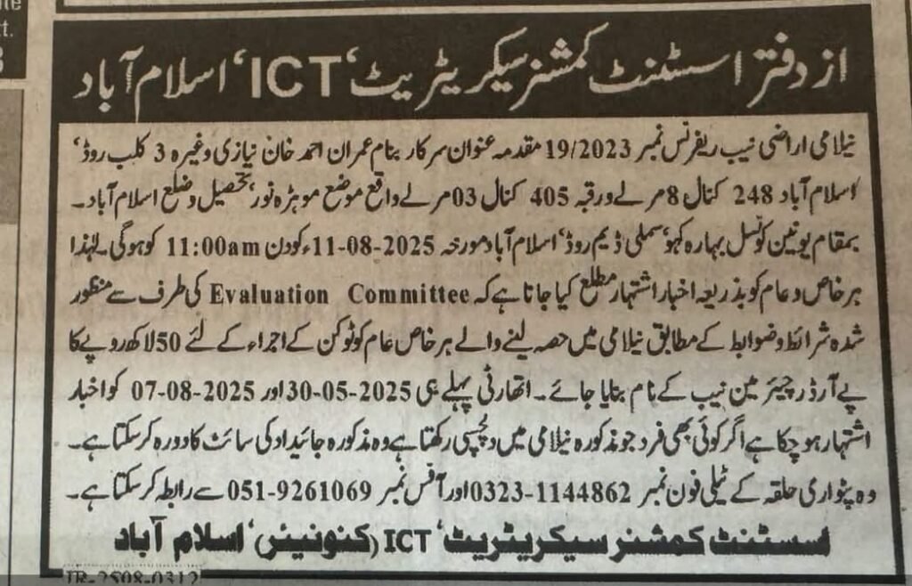 بمقام یونین کونسل بہارہ کہو سملی ڈیم روڈ اسلام آباد مورخہ 2025-08-11 کودن 11:00am کو ہوگی ۔ لہذا ہر خاص و عام کو بذریعہ اخبار اشتہار مطلع کیا جاتا ہے کہ Evaluation Committee کی طرف سے منظور شدہ شرائط و ضوابط کے مطابق نیلامی میں حصہ لینے والے ہر خاص عام کو ٹوکن کے اجراء کے لئے 50 لاکھ روپے کا پے آرڈر چیئر مین نیب کے نام بتایا جائے ۔ اتھارٹی پہلے ہی 2025-05-30 اور 2025-08-07 کو اخبار اشتہار ہو چکا ہے اگر کوئی بھی فرد جوند کورہ نیلامی میں دلچسپی رکھتا ہے وہ مذکو رہ جائیداد کی سائٹ کا دورہ کر سکتا ہے۔ وہ