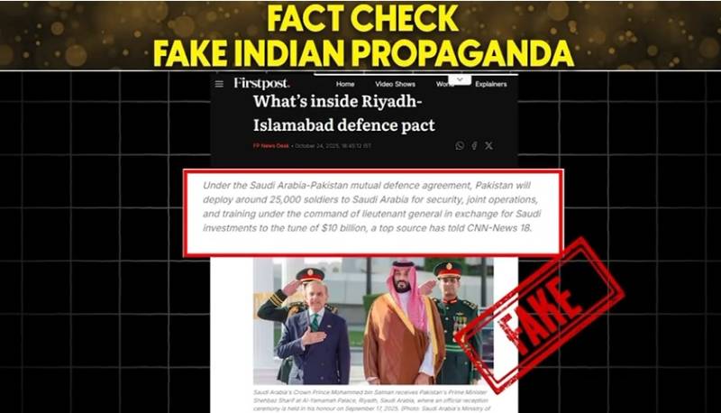 بھارت کے گودی میڈیا کا پاک سعودی دفاعی معاہدے سے متعلق من گھڑت بیانیہ کا پول کھل گیا ۔ بھارتی فرسٹ پوسٹ نے جھوٹا دعویٰ کیا کہ پاک سعودی فوجی معاہدہ کے تحت پاکستان 25 ہزار فوجی دستے سعودی عرب بھیجے گا۔ پاکستان سعودی عرب کو ایئر ڈیفنس اور راکٹ کمانڈ قائم کرنے میں تعاون بلکہ مختلف ہتھیاروں کے ساتھ شارٹ رینج میزائل سسٹم بھی فراہم کرے گا،فرسٹ پوسٹ میں یہ بھی جھوٹا دعویٰ کیا گیا کہ سعودی عرب چینی JF-17/J-10 خرید کر پاکستان میں 10 ارب ڈالر کی سرمایہ کاری اور افغان- بھارت امور میں سفارتی تعاون فراہم کرے گا،اس جھوٹے بیانیہ کے برعکس 17 ستمبر 2025 کو جاری کردہ پاک سعودی مشترکہ اعلامیہ کے مطابق کسی ایک ملک پر جارحیت کو دونوں ممالک پر جارحیت تصور کیا جائے گا۔ سعودی عرب یا پاکستان کی جانب سے دفاعی معاہدہ کی کوئی آپریشنل تفصیلات جاری نہیں کی گئیں۔ بین الاقوامی ذرائع ابلاغ نے بھی معاہدے سے متعلق فوجی تعیناتی یا اعداد و شمار کا کوئی ذکر نہیں کیا۔