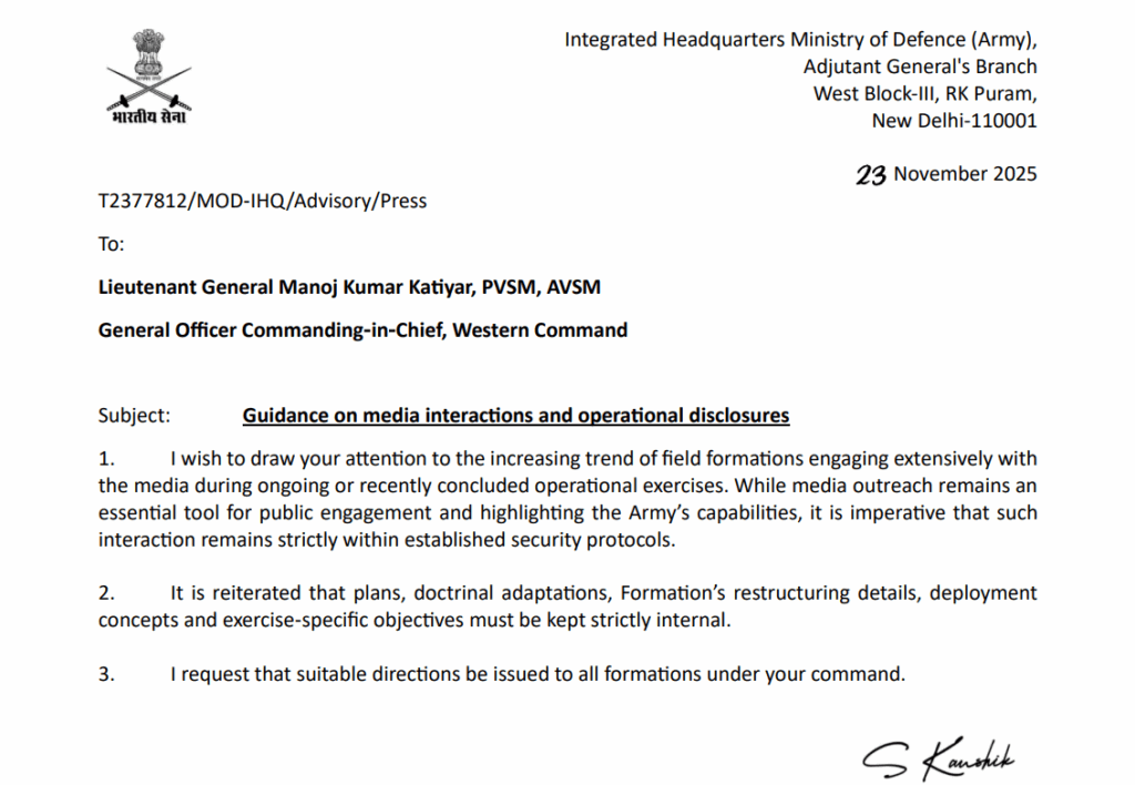 یہ ہدایات 23 نومبر 2025 کو وزارتِ دفاع کے انٹیگریٹڈ ہیڈکوارٹرز (آرمی) کی جانب سے ایک سرکاری ایڈوائزری میں جاری کی گئیں۔ایڈوائزری لیفٹیننٹ جنرل منوج کمار کٹیار، پی وی ایس ایم، اے وی ایس ایم، جنرل آفیسر کمانڈنگ ان چیف ویسٹرن کمانڈ کے نام ارسال کی گئی، جس میں فوجی فارمیشنز کی جانب سے بڑھتے ہوئے میڈیا روابط پر اظہارِ تشویش کیا گیا ہے۔دستاویز کے مطابق، متعدد فیلڈ فارمیشنز حالیہ اور جاری عسکری مشقوں کے دوران میڈیا سے وسیع پیمانے پر رابطہ کر رہی ہیں، جو کہ عوامی روابط کے لیے مفید ضرور ہے، مگر اس میں حساس معلومات کے سامنے آنے کا خطرہ بڑھ جاتا ہے۔ ایڈجٹینٹ جنرل برانچ نے واضح کیا کہ میڈیا انگیجمنٹ صرف طے شدہ سیکیورٹی پروٹوکول کے اندر رہتے ہوئے کی جائے۔اعلامیے میں سختی سے کہا گیا ہے کہ عسکری منصوبے،آپریشنل ڈپلائمنٹ کے تصورات،فارمیشنز کی ری اسٹرکچرنگ کی تفصیلات،مشقوں کے مقاصد،اور نظریاتی تبدیلیوں سے متعلق معلومات کو کسی بھی حالت میں میڈیا کے ساتھ شیئر نہ کیا جائے کیونکہ یہ معلومات صرف اندرونی استعمال کے لیے مخصوص ہیں۔اپنے زیرِ کمان تمام فارمیشنز کو واضح اور مؤثر ہدایات جاری کریں، تاکہ فوج کے آپریشنل راز اور حکمتِ عملی مکمل طور پر محفوظ رہیں۔