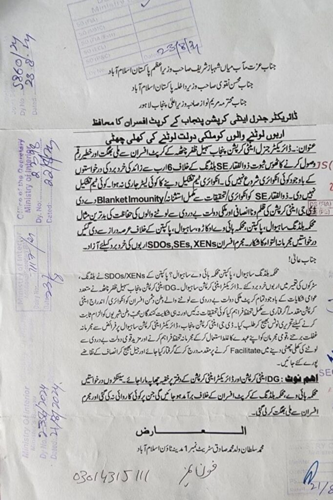 سنگین الزامات: شکایت میں کہا گیا ہے کہ اربوں روپے کا غبن ہوا ہے اور انسدادِ بدعنوانی کے ڈی جی نے ملزمان کی حفاظت کی ہے۔ شکایت کنندہ چاہتے ہیں کہ ڈی جی پنجاب سہیل ظفر چٹھہ کو گرفتار کر کے ان پر مقدمہ چلایا جائے اور انسدادِ بدعنوانی کے دفاتر پر چھاپہ مارا جائے۔درخواست وزیر اعظم، وزیر داخلہ اور وزیر اعلیٰ پنجاب کو بھیجی گئی ہے،