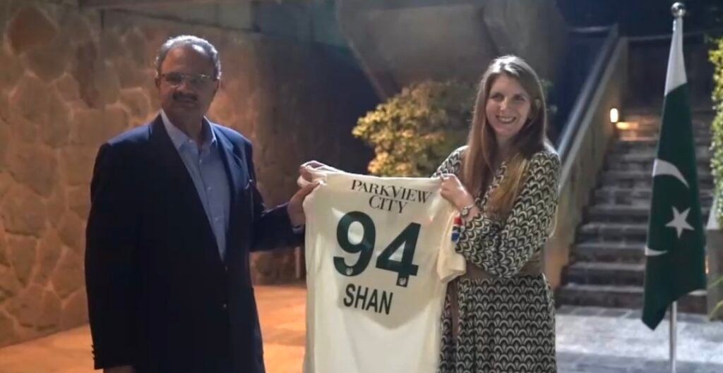 تقریب میں پاکستانی کرکٹ ٹیم کے منیجر نوید اکرم چیمہ نے پاکستانی ٹیم کے کپتان کی شرٹ برطانوی ہائی کمشنر جین میریٹ کو تحفہ کی،برطانوی ہائی کمشنر جین میریٹ نے تیسرے اور فیصلہ کن ٹیسٹ میچ کے لئے دونوں ٹیمز کے لیے نیک خواہشات کا اظہار کیا،اور کہا کہ خواہش تھی کہ دوسرا ٹیسٹ انگلینڈ جیتے مگر پاکستان کی فتح سے خوشی ہوئی ۔امید ہے تیسرے ٹیسٹ میں اچھا کھیل دیکھنے کو ملے گا۔پاک انگلینڈ ٹیسٹ سیریز دلچسپ موڑ پر آگئی ہے۔