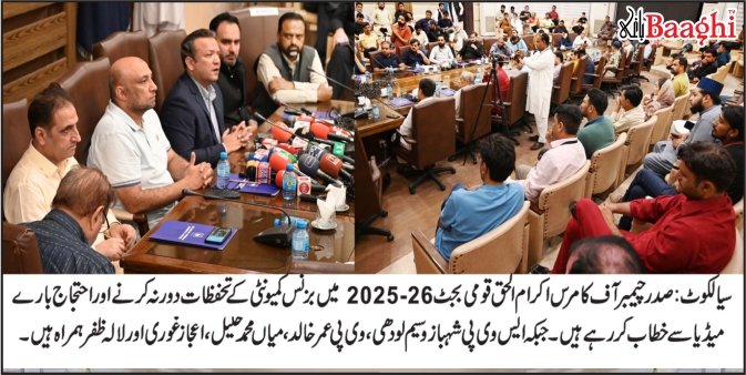 سیالکوٹ (باغی ٹی وی، بیورو چیف شاہد ریاض)سیالکوٹ کی بزنس کمیونٹی نے وفاقی بجٹ 2025-26 کو مکمل طور پر مسترد کرتے ہوئے 11 جولائی کو بھرپور احتجاج کا اعلان کر دیا ہے۔ سیالکوٹ چیمبر آف کامرس اینڈ انڈسٹری کے صدر اکرام الحق نے میڈیا سے گفتگو کرتے ہوئے کہا کہ یہ بجٹ کاروباری طبقے کے خلاف ایک کھلی جنگ ہے، جس کے ذریعے معیشت کا گلا گھونٹنے کی سازش کی گئی ہے۔