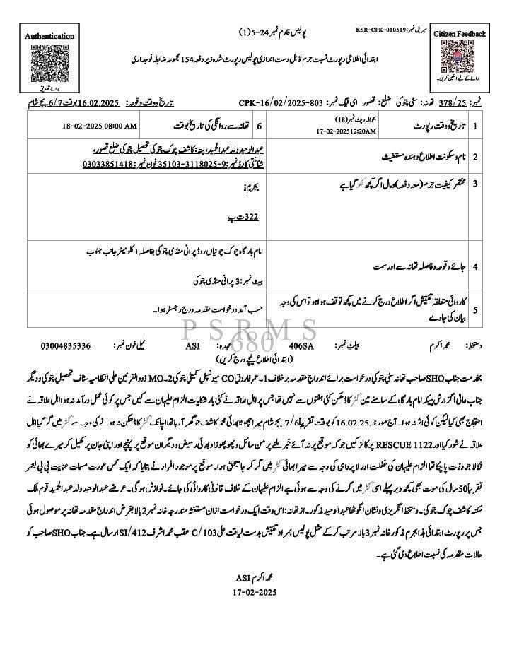 جاں بحق نوجوان کے بھائی عبد الوحید کی مدعیت میں میونسپل کمیٹی کے چیف آفیسر عمر فاروق، ایم او آئی ذوالقرنین علی اور دیگر ملازمین کے خلاف مقدمہ درج کر لیا گیا ہے۔ ایف آئی آر کے مطابق اہل علاقہ نے کئی بار متعلقہ حکام کو کھلے گٹر کی خطرناک صورتحال سے آگاہ کیا، مگر کوئی اقدام نہ اٹھایا گیا، جس کے باعث یہ حادثہ پیش آیا۔