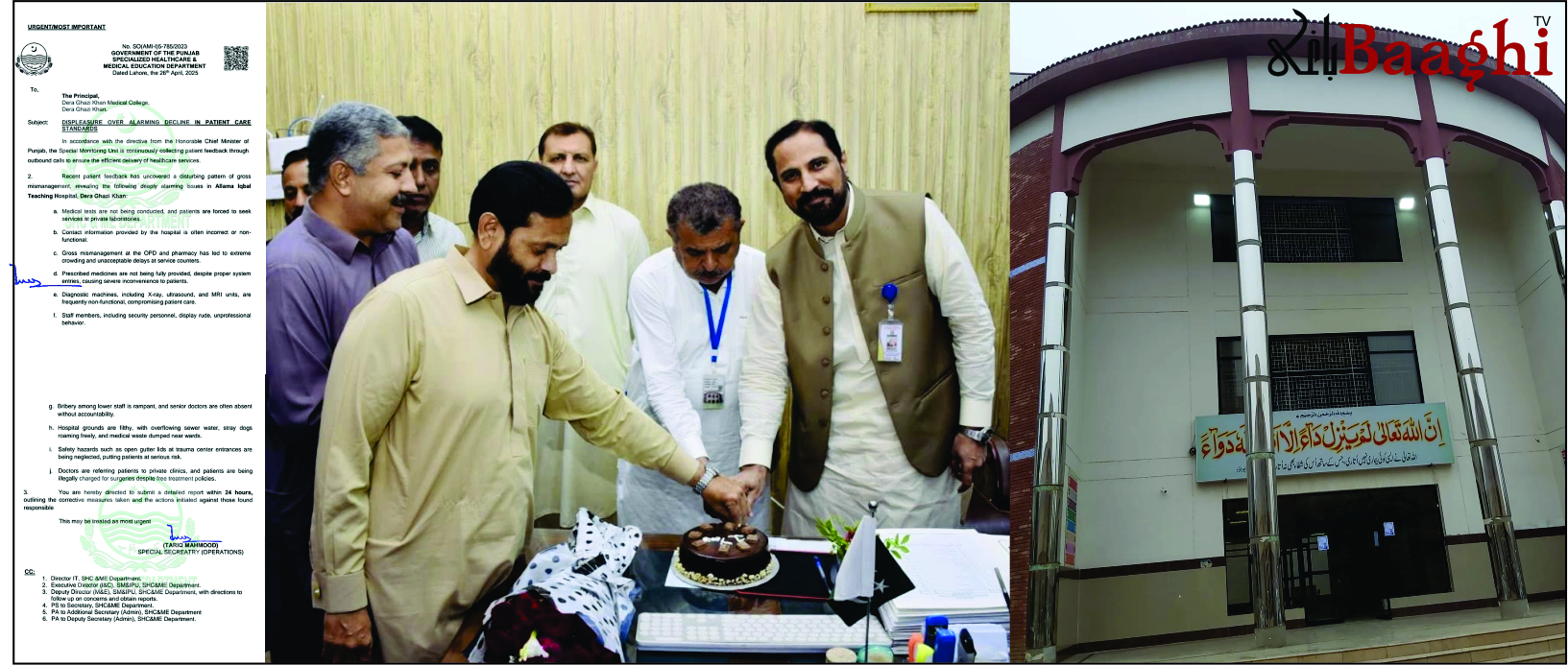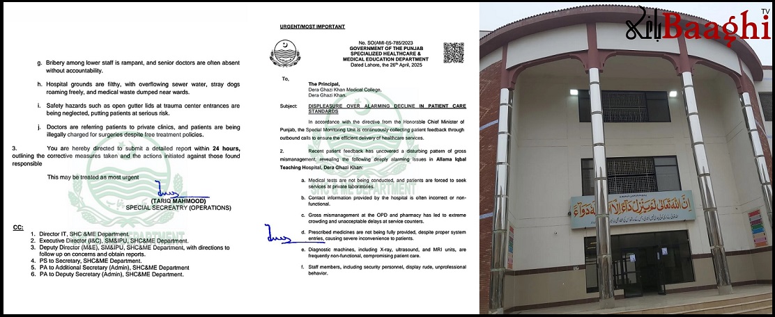 ڈیرہ غازیخان (باغی ٹی وی خصوصی رپورٹ) علامہ اقبال ٹیچنگ ہسپتال ڈیرہ غازی خان میں طبی سہولیات کی سنگین زبوں حالی نے پنجاب حکومت کو ہلا کر رکھ دیا ہے۔