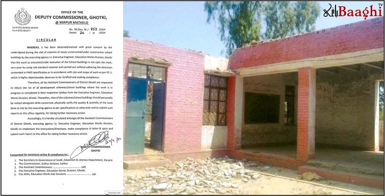 میرپور ماتھیلو(باغی ٹی وی ،نامہ نگارمشتاق لغاری)ڈپٹی کمشنر گھوٹکی ڈاکٹر سید محمد علی نے محکمہ ایجوکیشن ورکس کے تحت اسکولوں میں جاری ترقیاتی اور مرمتی کاموں کو غیرمعیاری قرار دیتے