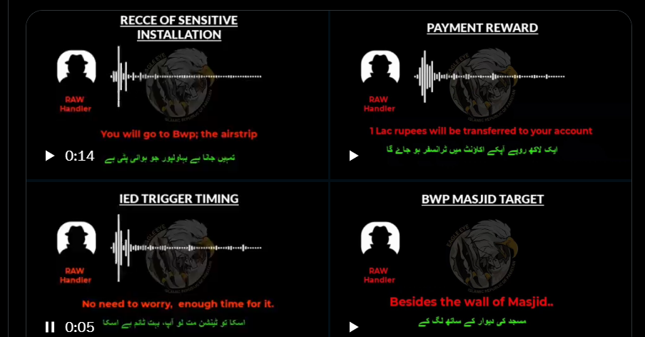 انڈین دہشتگرد ایجنسی "را” کے 6 سہولت کار پنجاب کے مختلف اضلاع سے گرفتارکر لئے گئے، ترجمان سی ٹی ڈی کے مطابق ٹوبہ ٹیک سنگھ سے دھماکہ خیز مواد اور ڈیٹونیٹرز برآمد کر لیا گیا،بہاولپور میں دبئی سے فنڈنگ کرنے والا "را” کا سہولت کار رنگے ہاتھوں گرفتار کر لیا گیا،بھارتی بارڈر سکیورٹی فورس (BSF) سے براہ راست IEDs حاصل کرنے والے 2 افراد بہاولنگر سے گرفتار کر لئے گئے،سی ٹی ڈی نے بہاولپور میں مسجد اور ریلوے سٹیشن پر حملے کی منصوبہ بندی بے نقاب کر دی،”را” افسران میجر رویندرا راٹھور اور انسپکٹر سنگھ کی آڈیو انٹرسیپٹس (intercepts) حاصل کر لی گئی،بھارت سے ملنے والی ہدایات میں ٹارگٹ کلنگ اور حساس مقامات پر حملے شامل تھے