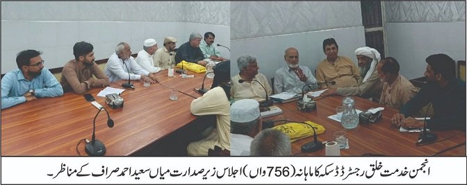 ڈسکہ (باغی ٹی وی نامہ نگار ملک عمران) انجمن خدمت خلق رجسٹرڈ ڈسکہ کا 756 واں ماہانہ اجلاس زچہ بچہ ہسپتال پسرور روڈ پر سینئر نائب صدر خان عباس خان کی زیر صدارت منعقد ہوا۔ اجلاس کا آغاز حافظ عبدالغفار کی تلاوتِ قرآن پاک سے ہوا، جبکہ نعت رسول مقبول ﷺ انوار احمد سیال نے پیش کی۔ جنرل سیکرٹری کی غیر موجودگی میں ایگزیکٹو ممبر شاہ نواز مغل ایڈووکیٹ نے گزشتہ اجلاس کی کارروائی پیش کی، جسے متفقہ طور پر منظور کیا گیا۔