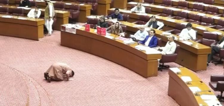 اجلاس کے دوران جمشید دستی چیئرمین پی ٹی آئی بیرسٹر گوہر اور اپوزیشن لیڈر عمر ایوب کے پاس پہنچے اور ان سے کچھ دیر گفتگو کی۔بعد ازاں جمشید دستی اپنی نشست سے اٹھ کر اپوزیشن لیڈر کے سامنے فلور پر بیٹھ گئے اور کئی بار زمین پر ناک رگڑتے ہوئے لکیریں نکالیں۔ اس کے ساتھ ساتھ وہ ہاتھ جوڑتے اور کانوں کو ہاتھ لگاتے ہوئے واپس اپنی نشست پر چلے گئے۔