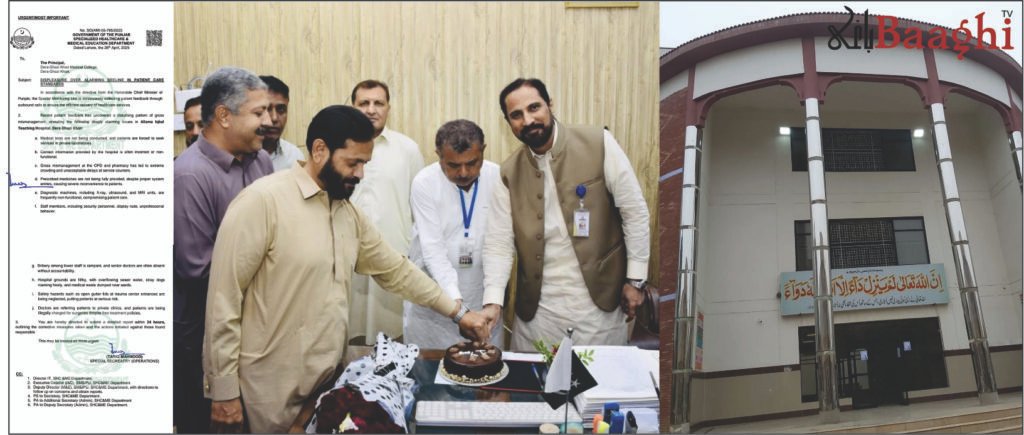 ڈیرہ غازیخان (باغی ٹی وی خصوصی رپورٹ) علامہ اقبال ٹیچنگ ہسپتال ڈیرہ غازی خان میں طبی سہولیات کی سنگین زبوں حالی نے پنجاب حکومت کو ہلا کر رکھ دیا ہے۔ محکمہ اسپیشلائزڈ ہیلتھ کیئر اینڈ میڈیکل ایجوکیشن کی جانب سے جاری کردہ سخت نوٹس، سرکاری مراسلہ نمبر SO(AMI-I)5-785/2023 کے مطابق جہاں مریض بنیادی علاج کے لیے بھی ترس رہے ہیں، وہیں ہسپتال کے میڈیکل سپرنٹنڈنٹ (ایم ایس) اپنی ایک سالہ کارکردگی کا جشن کیک کاٹ کر منا رہے تھے۔ اس صورتحال پر سخت نوٹس لیتے ہوئے وزیر اعلیٰ پنجاب نے فوری ایکشن کا حکم دے دیا ہے لیکن کیا اب ان بے بس مریضوں کا حساب ہو پائے گا جنہیں لاوارث چھوڑ دیا گیا؟