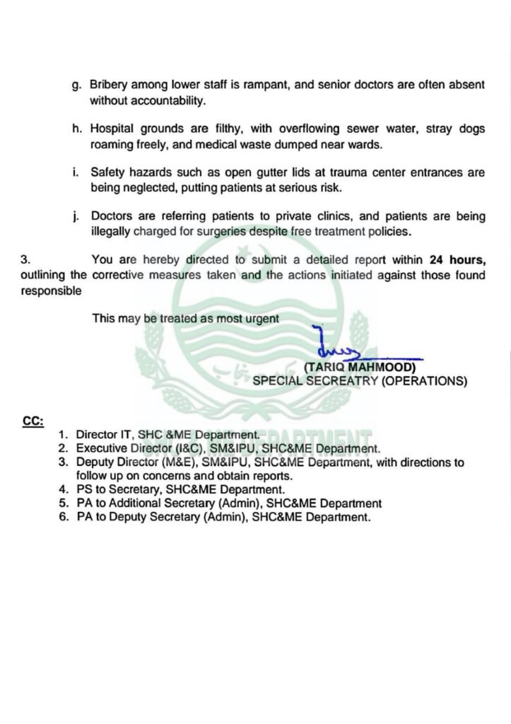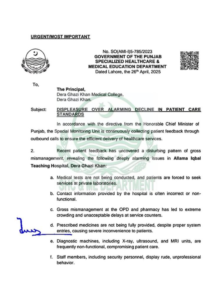 وزیر اعلیٰ پنجاب کے اسپیشل مانیٹرنگ یونٹ کی جانب سے مریضوں سے کی گئی آؤٹ باؤنڈ کالز نے ہسپتال میں بدانتظامی کی خوفناک داستانیں کھول کر رکھ دیں۔ سرکاری مراسلے نمبر SO(AMI-I)5-785/2023 میں درج سنگین انکشافات کے مطابق مریض طبی ٹیسٹوں کے لیے نجی لیبارٹریوں کے رحم و کرم پر ہیں، ہسپتال کا رابطہ نمبر غیر فعال ہے او پی ڈی اور فارمیسی پر ناقابل برداشت رش ہے اور مریضوں کو پوری دوائیں تک میسر نہیں۔