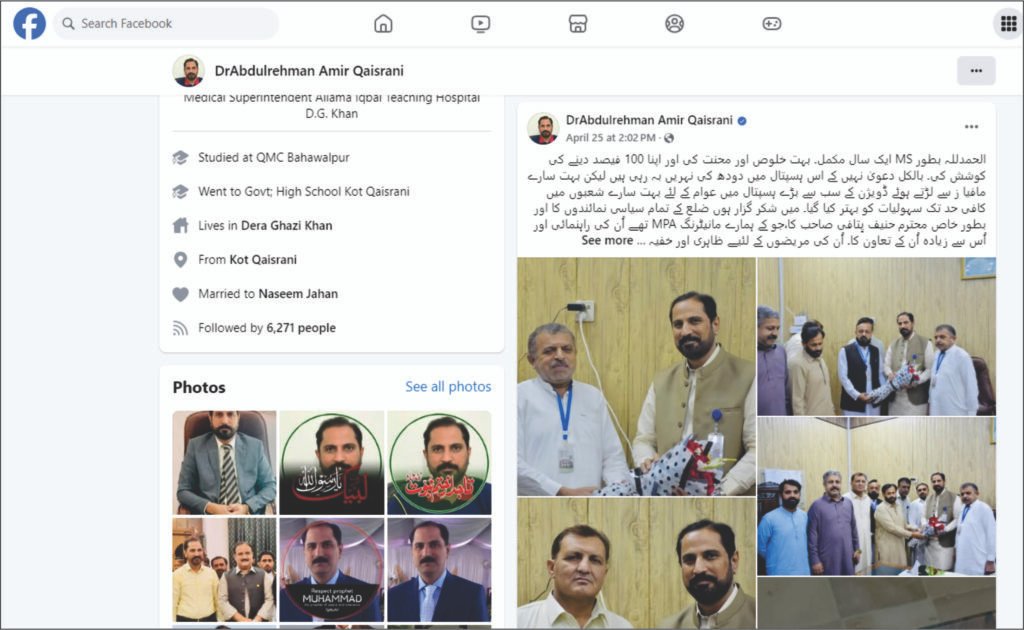 دوسری جانب 25 اپریل 2025 کو جب ہسپتال میں مریض سسک رہے تھے، ایم ایس ڈاکٹر عبدالرحمن عامر قیصرانی اپنی ایک سالہ کارکردگی کا جشن منا رہے تھے۔ انہوں نے اپنے دفتر میں کیک کاٹا اور اپنی "کامیابیوں” کا ڈھنڈورا فیس بک پر پیٹا۔ ان کے دعوے مریضوں کی چیخوں اور حکومت پنجاب کے جاری کردہ سخت نوٹس (نمبر SO(AMI-I)5-785/2023) کی کھلی تضحیک ہیں۔