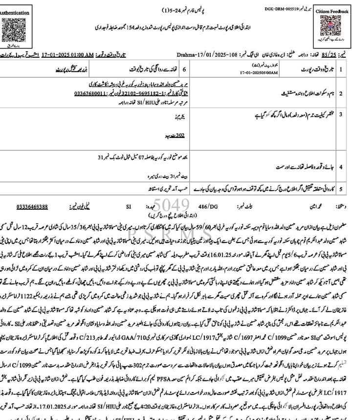 پولیس نے لاش قبضہ میں لیکر پوسٹ مارٹم اور قانونی کارروائی کے بعد لاش ورثا کے حوالے کر دی ہے اورتھانہ دراہمہ پولیس نے مقدمہ نمبر85/25 زیر دفعہ 302 درج کرکے قانونی کارروائی کاآغاز کردیا ہے۔