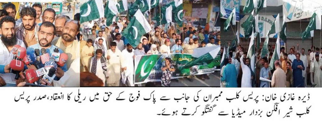 ڈیرہ غازی خان (باغی ٹی وی ،سٹی رپورٹرجواداکبر) پریس کلب ڈیرہ غازی خان کے زیر اہتمام صدر شیر افگن بزدار کی قیادت میں "یومِ تشکر” کے عنوان سے پاک فوج کی عظیم قربانیوں اور خدمات کو خراجِ تحسین پیش کرنے کے لیے ایک خصوصی تقریب اور ریلی کا انعقاد کیا گیا۔ اس موقع پر مقامی صحافیوں، سماجی شخصیات اور شہریوں نے بڑی تعداد میں شرکت کی اور پاک فوج سے اپنی مکمل یکجہتی اور حمایت کا اظہار کیا۔