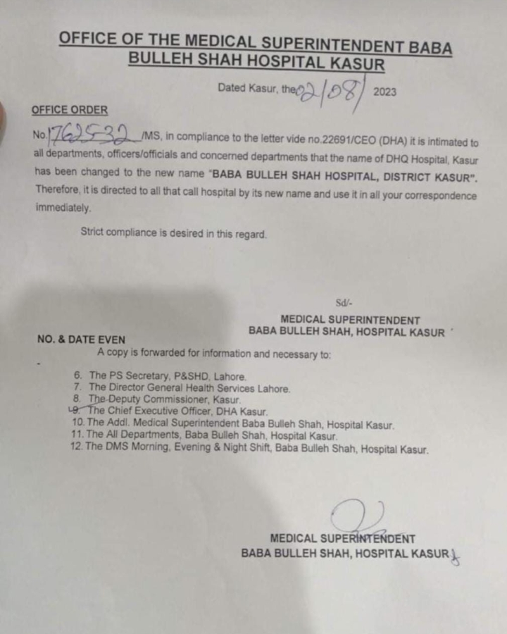 ڈی ایچ کیو ہسپتال قصور کا نام تبدیل کرکے بابا بلہے شاہ ہسپتال رکھ دیا گیا،نوٹیفیکیشن جاری