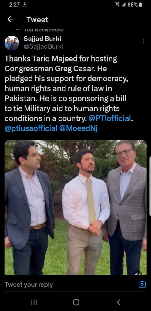بلنکن کو خط لکھنا، کانگریسیوں کا اکٹھا کرنا، اور حالیہ سجاد برکی کا ایک ٹویٹ۔ وہ مبینہ طور پر امریکہ میں عمران خان کے نمائندہ ہیں اور پی ٹی آئی امریکہ کے سابق صدر بھی تھے۔ ٹویٹ میں کہتے ہیں ،”کانگریس مین گریگ کیسر کی میزبانی کے لیے مسٹر طارق مجید کا شکریہ۔ انہوں نے پاکستان میں جمہوریت، انسانی حقوق اور قانون کی حکمرانی کے لیے اپنی حمایت کا وعدہ کیا۔ وہ ملٹری ایڈ کو ملک میں انسانی حقوق کے حالات سے جوڑنے کے لیے ایک بل کی معاونت کر رہے ہیں۔