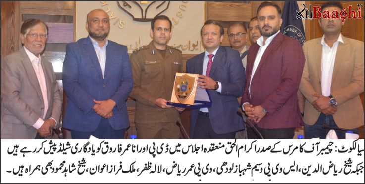 سیالکوٹ (باغی ٹی وی بیوروچیف شاہد ریاض) ڈسٹرکٹ پولیس آفیسر (ڈی پی او) سیالکوٹ رانا عمر فاروق نے سیالکوٹ چیمبر آف کامرس اینڈ انڈسٹری کا دورہ کیا۔ اس موقع پر سیالکوٹ چیمبر کے صدر اکرام الحق، سینئر نائب صدر وسیم شہباز لودھی اور نائب صدر عمر خالد نے ڈی پی او کا پرتپاک استقبال کیا۔