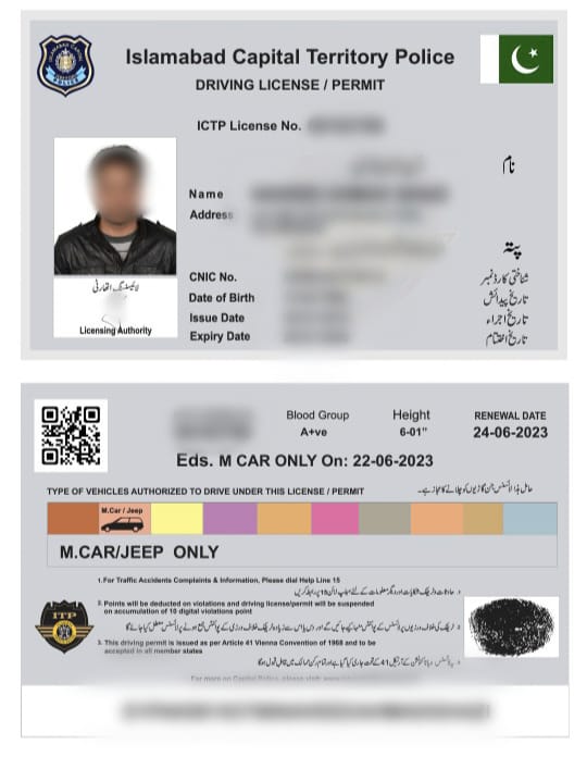 نگران وزیراعظم پاکستان کے وژن اور نگران وفاقی وزیر داخلہ سرفراز احمد بگٹی کی ہدایات پر اسلام آباد ٹریفک پولیس میں بنیادی اصلاحات کردی گئیں اور اسلام بآباد پولیس کی جانب سے جاری اعلامیہ کے مطابق بین الاقوامی معیار کا دو زبانوں پر مشتمل ڈرائیونگ لائسنس کا اجراء کیا جارہا ہے تاہم اسلام آباد پولیس کا جاری کردہ ڈرائیونگ لائسنس بین الاقوامی طور استعمال کیا جا سکے گا۔