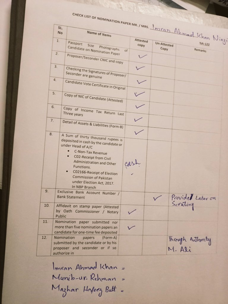 عمران خان کے لاہور کے حلقہ این اے 122 سے کاغذات نامزدگی جمع
