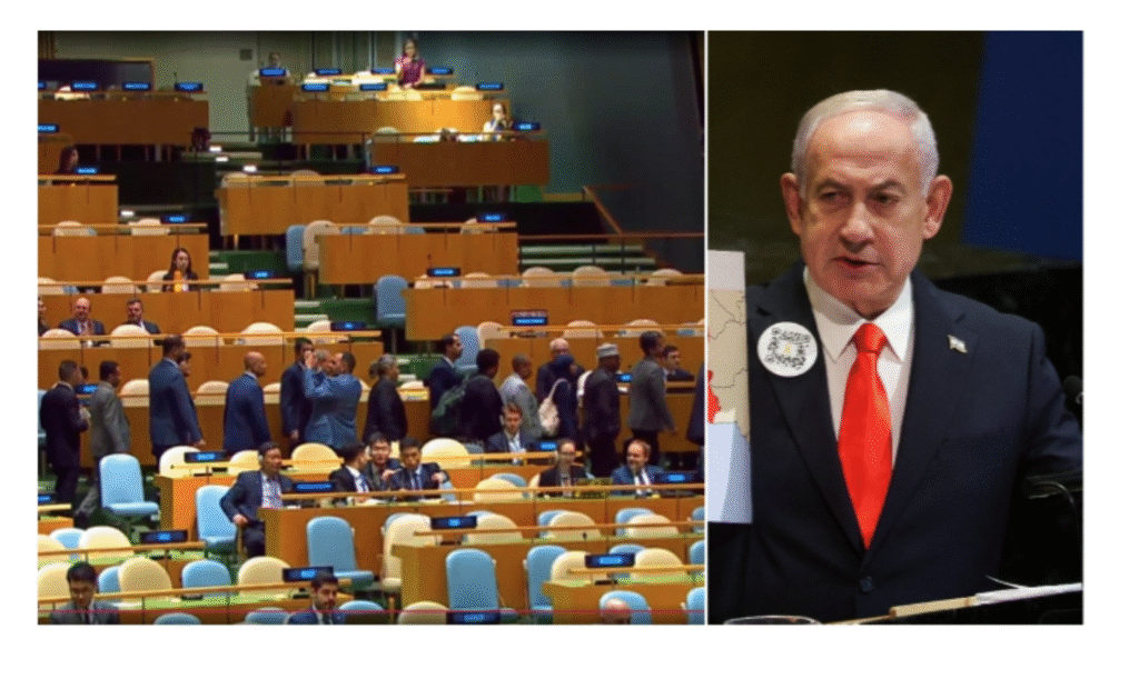 نیویارک: اقوام متحدہ کی جنرل اسمبلی کے اجلاس میں اسرائیلی وزیراعظم بنیامن نیتن یاہو کے خطاب کے دوران کئی ممالک کے وفود احتجاجاً ہال سے اٹھ کر باہر چلے گئے۔ اس اقدام نے عالمی سطح پر اسرائیل کی پالیسیوں کے خلاف بڑھتی ہوئی بے چینی کو ایک بار پھر نمایاں کر دیا۔