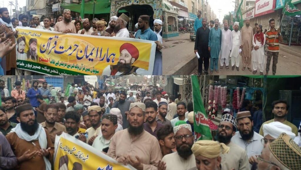 تفصیل کے مطابق سویڈن میں قرآن پاک کی سرکاری سطح پر بے حرمتی کے خلاف پاکستان سنی تحریک کی جانب سے میرپورخاص میں احتجاجی ریلی نکالی گئی،جسکی قیادت پاکستان سنی تحریک مرکزی رابطہ کمیٹی کے رکن التماس قادری ضلعی صدر فہیم قریشی اور سٹی صدر عمران سراج عطاری نے کی، ریلی کے شرکاء سے التماس صابر نے کہا کہ قرآن کریم مسلمانوں کی ریڈ لائن ہے جو ہم مسلمان کسی کو کراس نہیں کرنے دینگے، ہم سویڈن حکومت ناپاک عمل کی بھرپور مذمت کرتے ہیں ، ریلی کے شرکاء نے حکومت سے مطالبہ کیا کہ سویڈن حکومت کا بائیکاٹ کیا جائےاور اس اہم ترین مسئلے پر اقوام متحدہ میں آواز اٹھائے،ریلی کے شرکاء نے ہاتھوں میں پلے کارڈ لیکر حرمت قرآن پر جان بھی قربان ہے اور سویڈن حکومت کے خلاف فلک شگاف نعرے لگارہے تھے جبکہ ریلی میں علامہ حافظ محمود قادری ،علامہ حافظ محمد صادق سعیدی، علامہ حافظ غلام حسین نقشبندی ،التماس صابر عمران عطاری کے علاوہ سینکڑوں لوگ شریک تھے-