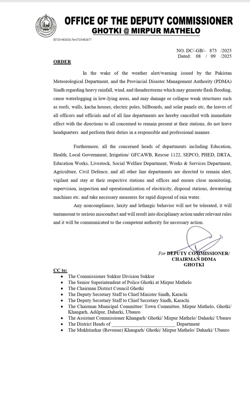 میرپورماتھیلو (باغی ٹی وی،نامہ نگارمشتاق لغاری) ڈپٹی کمشنر گھوٹکی منظور احمد کنرانی نے ضلع میں متوقع شدید بارشوں کے پیشِ نظر ہنگامی صورتحال کا اعلان کرتے ہوئے متعلقہ محکموں کے تمام افسران اور عملے کی چھٹیاں فوری طور پر منسوخ کر دی ہیں۔ یہ فیصلہ محکمہ موسمیات کی اس پیشگوئی کے بعد کیا گیا ہے جس میں آئندہ چند دنوں میں گھوٹکی اور اس کے گرد و نواح میں تیز اور مسلسل بارشوں کا امکان ظاہر کیا گیا ہے۔