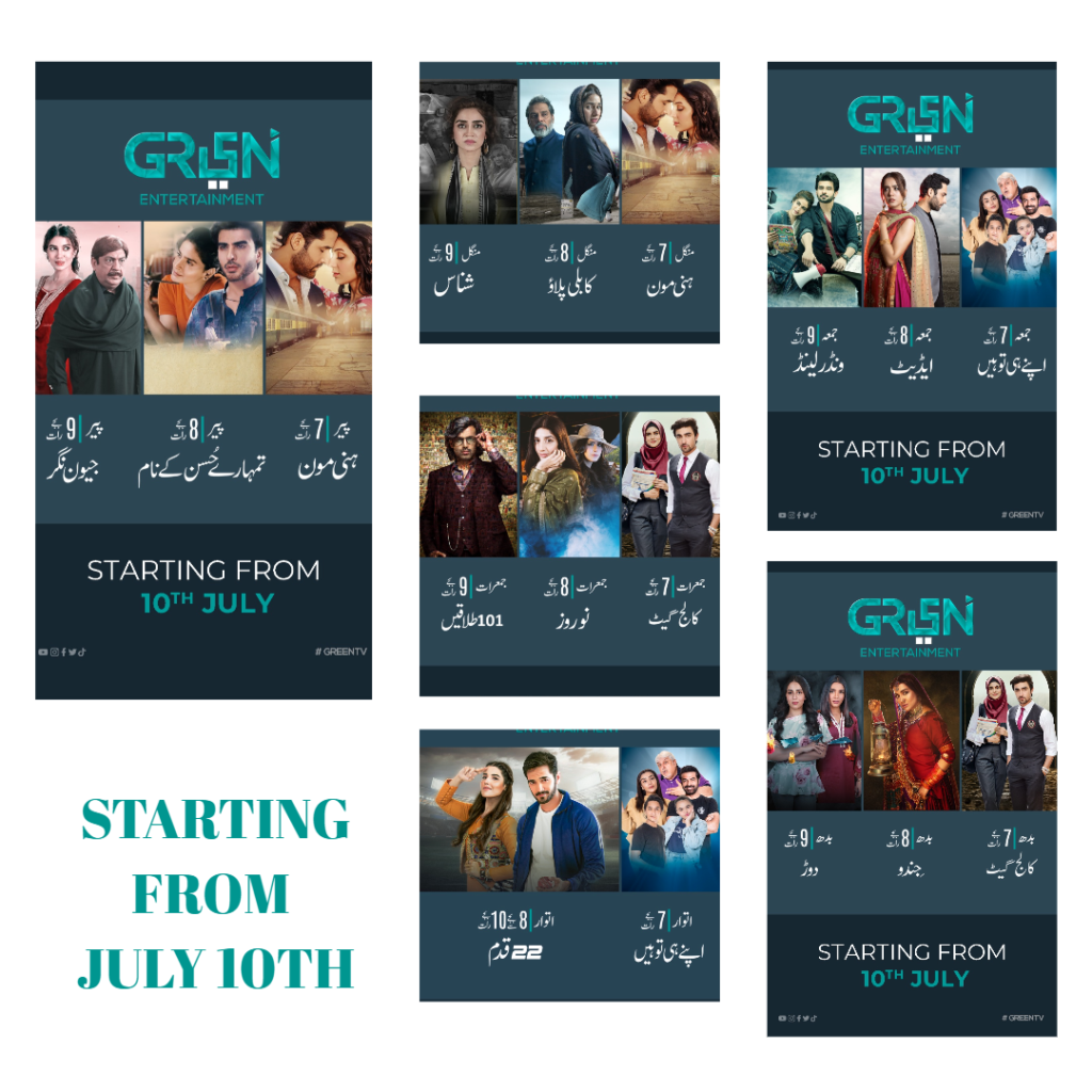 اس کے بعد رات 8 بجے ‘تمہارے حسن کے نام’، اور رات 9 بجے دلچسپ سماجی تبصرے ‘جیون نگر’ کے ساتھ اختتام پذیر ہوگا۔منگل کی رات 7 بجے رومانوی ڈراموں ‘ہنی مون’ اور رات 8 بجے ‘کابلی پلاؤ’ کے ساتھ جوش و خروش جاری رہے گا۔ جبکہ رات 9 بجے سیریز ’شناس‘ سامعین کو رشتوں اور شناخت پر ایک دلچسپ ڈائنامک فراہم کرے گی۔”چینل بدھ کے روز شام 7 بجے ہائی اسکول کے ڈرامہ ‘کالج گیٹ’ سے شروعات کریگا، اس کے بعد رات 8 بجے ‘جندو’ اور آخر میں رات 9 بجے ‘ڈور دکھائے گا ”۔اسی طرح سے ویک اینڈ تک مختلف قسم کے پروگرامز دکھائے جائیں گے. یاد رہے کہ گرین ٹی وی کے ڈراموں کے چلنے والے پروموز کافی پسند کئے جا رہے ہیں اور شائقین اس چینل کی باقاعدہ نشریات کے آغاز کی منتظر ہے.