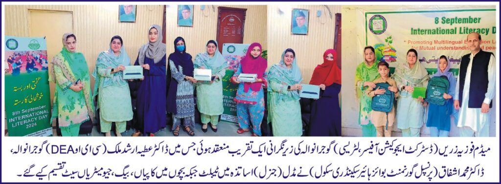 گوجرانوالہ (باغی ٹی وی نامہ نگار محمد رمضان نوشاہی)ڈسٹرکٹ ایجوکیشن آفیسر لٹریسی فوزیہ زریں کی زیر نگرانی ایک تقریب منعقد ہوئی جس میں سی ای او ایجوکیشن ڈاکٹر عطیہ ارشد ملک مہمانِ خصوصی تھیں۔ اس موقع پر اساتذہ میں ٹیبلٹس جبکہ طلبہ میں بیگز، کاپیاں، جیومیٹری بکس اور پینسلیں تقسیم کی گئیں۔