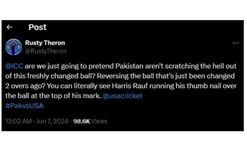 پاکستان کے فاسٹ بولر حارث رؤف کو اس وقت سنگین الزامات کا سامنا ہے 6 جون کو ڈیلاس میں امریکا کے خلاف ٹی ٹوئنٹی ورلڈ کپ کے میچ کے دوران سابق جنوبی افریقی کرکٹر اور یو ایس اے کرکٹ ٹیم کے موجودہ رکن رسٹی تھیرون نے بال ٹیمپرنگ کا الزام لگایا ہے۔امریکی کرکٹر رسٹی تھیرون نے ”ایکس“ پر کی گئی پوسٹ میں حارث رؤف پر بال ٹیمپرنگ کا الزام عائد کرتے ہوئے لکھا کہ میچ کے دوران حارث نے انگوٹھے کے ناخن کا استعمال کرتے ہوئے گیند کے ساتھ چھیڑ چھاڑ کرنے کی کوشش کی۔