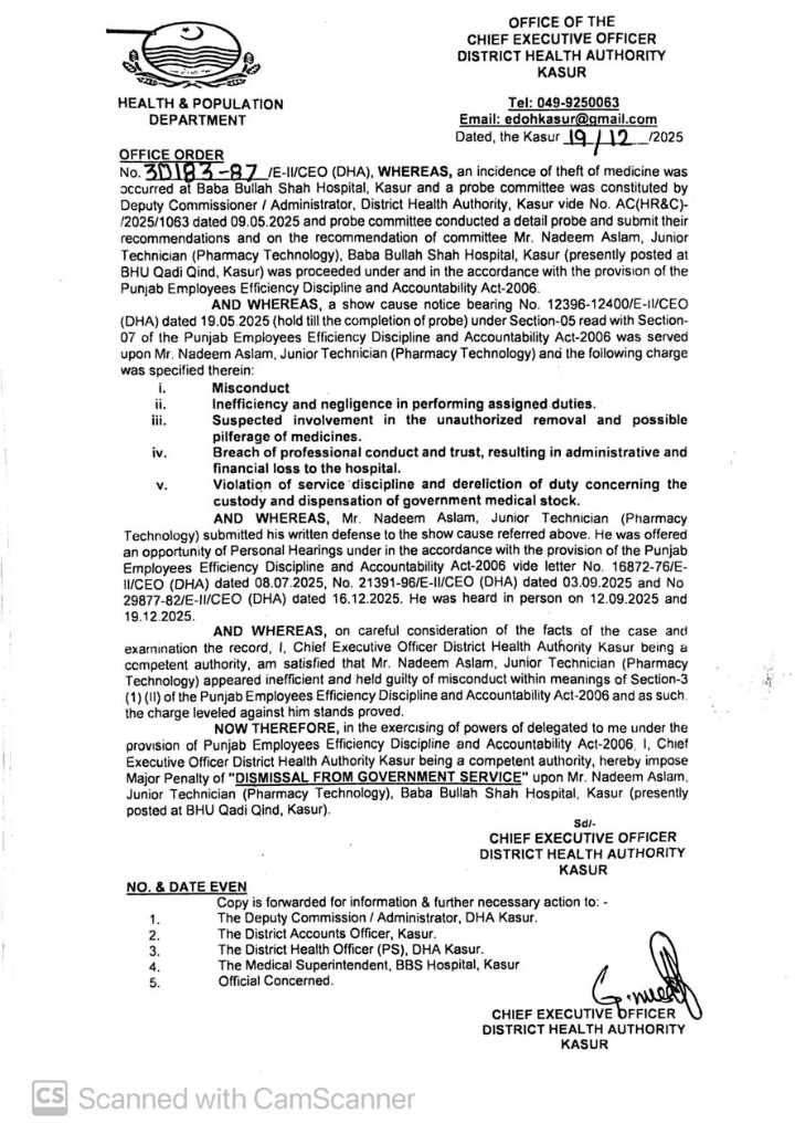 محکمہ صحت قصور نے اہلکاروں کے خلاف باضابطہ حکم نامہ جاری کر کے نوکری سے نکالنے کی کارروائی مکمل کر لی ہے۔ ذرائع کا کہنا ہے کہ یہ کارروائی اندرونی نگرانی اور رپورٹنگ کے نتیجے میں ممکن ہوئی