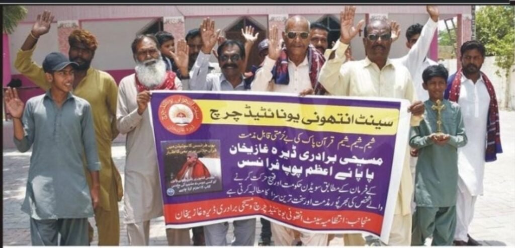ڈیرہ غازیخان ،باغی ٹی وی (بیوروچیف قیصرعباس جعفری ) سویڈن کا دل خراش واقعہ نہ صرف امت مسلمہ بلکہ پوری دنیا کے مسیحوں کے لیے دکھ اور غم و غصے کا باعث بنا، ملعون کو سخت سزا دی جائے حکومت سویڈن کےسفیر کو فوری طور پر ملک بدر کرے ان خیالات کا اظہار منتظم اعلی سینٹ اینتھونی یونائٹڈ چرچ سلیم الیاس مسیح نے سینٹ انتھونی یونائٹڈ چرچ ڈیرہ غازی خان میں سویڈن کے حوالے سے ریلی سے خطاب کرتے ہوئے کہا اس موقع پر خادم چرچ پیٹر جوزف گول نے کہا کہ امت مسلمہ کے اس دکھ اور افسوس کی گھڑی میں مسیحی برادری ان کے ساتھ ہے، یونس پرویز مسیح سابق ممبرضلع کونسل نے ریلی سے خطاب کرتے ہوئے عالمی برادری سے مطالبہ کیا کہ ملعون شخص کو سرعام پھانسی اور سویڈن پر عالمی پابندیاں عائد کی جائیں، ریلی سے عامر پرویز مسیح بابا شاہد مسیح آصف جان ساور یونس کامران و دیگر نے سویڈن میں واقعہ قران شریف کے حوالے سے سخت غم و غصے کا اظہار کیا اور آخر میں دنیا بھر میں امن و امان محبت بھائی چارے کی فضا قائم کرنے کے لیے خصوصی دعا کروائی گئی-