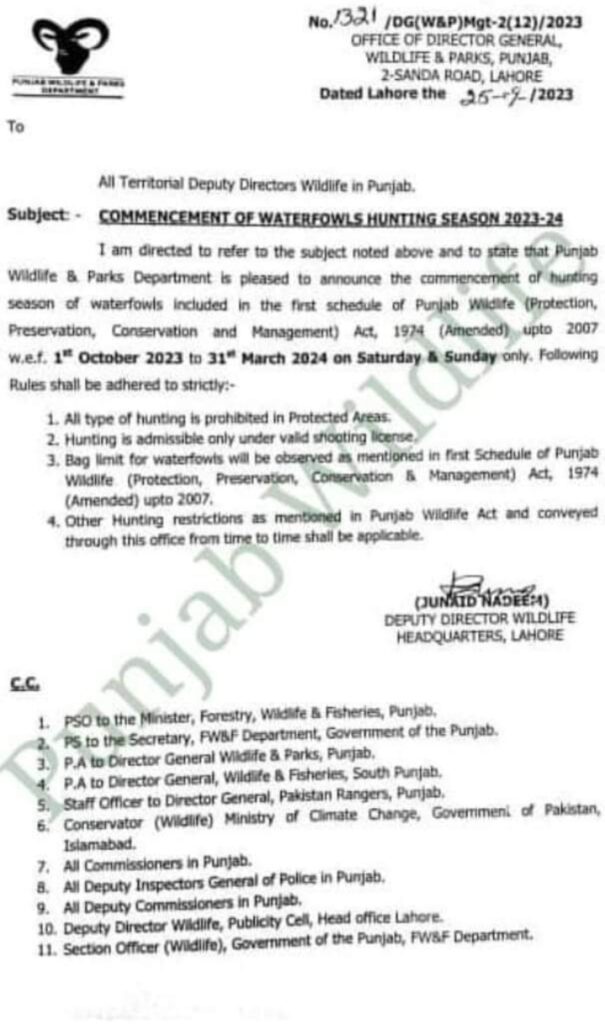 محکمہ وائلڈ لائف اینڈ پارکس پنجاب اینڈ وائلڈ لائف ایکٹ، 1974 کے پہلے شیڈول میں شامل آبی و دیگر مخصوصہ پرندوں کے شکار کے سیزن کے آغاز کا اعلان کرتے ہوئے 1 اکتوبر 2023 سے 31 مارچ 2024 تک صرف ہفتہ،اتوار کے دن شکار کی اجازت دی ہے اور ضلع بھر کے آفیسرز کو حکم جاری کیا ہے کہ