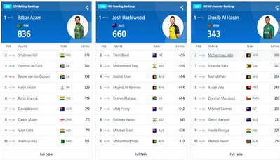 جبکہ بابر اعظم واحد بلے باز ہیں جو ون ڈے، ٹی 20 اور ٹیسٹ کرکٹ کے ٹاپ فائیو میں شامل ہیں، وہ ٹی 20 بیٹرز میں چوتھے جبکہ ٹیسٹ فارمیٹ میں بھی چوتھے نمبر پر ہیں اور ٹی 20 اور ون ڈے میں پاکستان کا کوئی بولر ٹاپ 10 میں جگہ نہ بنا سکا البتہ شاہین آفریدی ٹیسٹ رینکنگ کے ٹاپ 10 میں شامل ہیں جبکہ ون ڈے بولرز کی رینکنگ میں آسٹریلیا کے جوش ہیزل ووڈ کا پہلا اور نیوزی لینڈ کے ٹرینٹ بولٹ کا دوسرا نمبر ہے جبکہ بھارت کے محمد سراج تیسری پوزیشن پر براجمان ہیں لیکن ون ڈے آل راؤنڈرز میں بنگلا دیش کے شکیب الحسن سرفہرست موجود ہیں۔