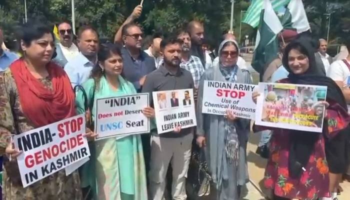 مظاہرین نے اقوام متحدہ کے دفتر کے سامنے جمع ہو کر بھارت کے زیرِ قبضہ جموں و کشمیر میں جاری انسانی حقوق کی سنگین خلاف ورزیوں پر شدید مذمت کا اظہار کیا۔مظاہرین نے اپنے نعروں اور پلے کارڈز کے ذریعے بھارتی مظالم کے خلاف آواز بلند کی اور آبادیاتی تبدیلیوں پر گہری تشویش ظاہر کی.مظاہرین کی جانب سے آر ایس ایس کی انتہا پسندانہ سوچ اور مودی سرکار کے ایجنڈے کو تنقید کا نشانہ بنایا گیا.