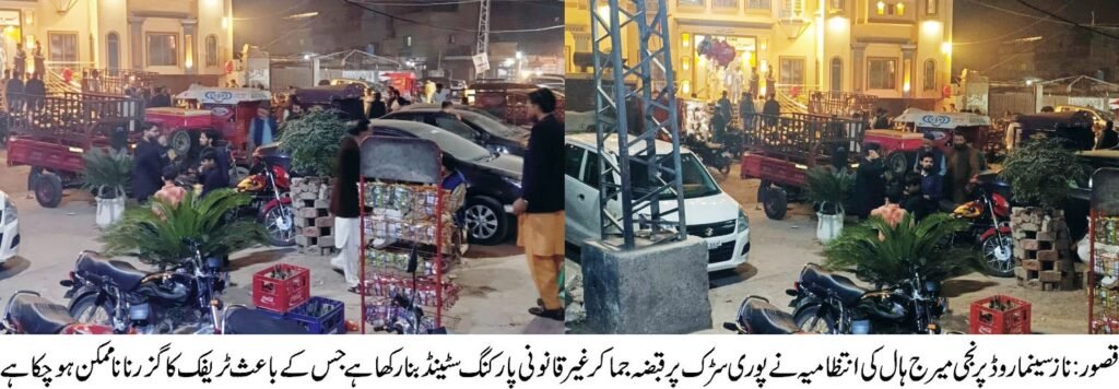 تفصیلات کے مطابق، ناز سینما روڈ قصور پر واقع سردار میرج ہال کی انتظامیہ نے غنڈہ گردی اور اپنے اثرورسوخ کے باعث میرج ہال کے باہر کنکوڈیا کالج کی جانب جانے والی سڑک کے درمیان اور دونوں اطراف غیر قانونی پارکنگ سٹینڈ قائم کر رکھا ہے۔ اس کے نتیجے میں ٹریفک جام رہنا معمول بن چکا ہے اور علاقہ مکینوں سمیت گزرنے والی گاڑیوں اور راہگیروں کو سخت مشکلات کا سامنا کرنا پڑ رہا ہے۔